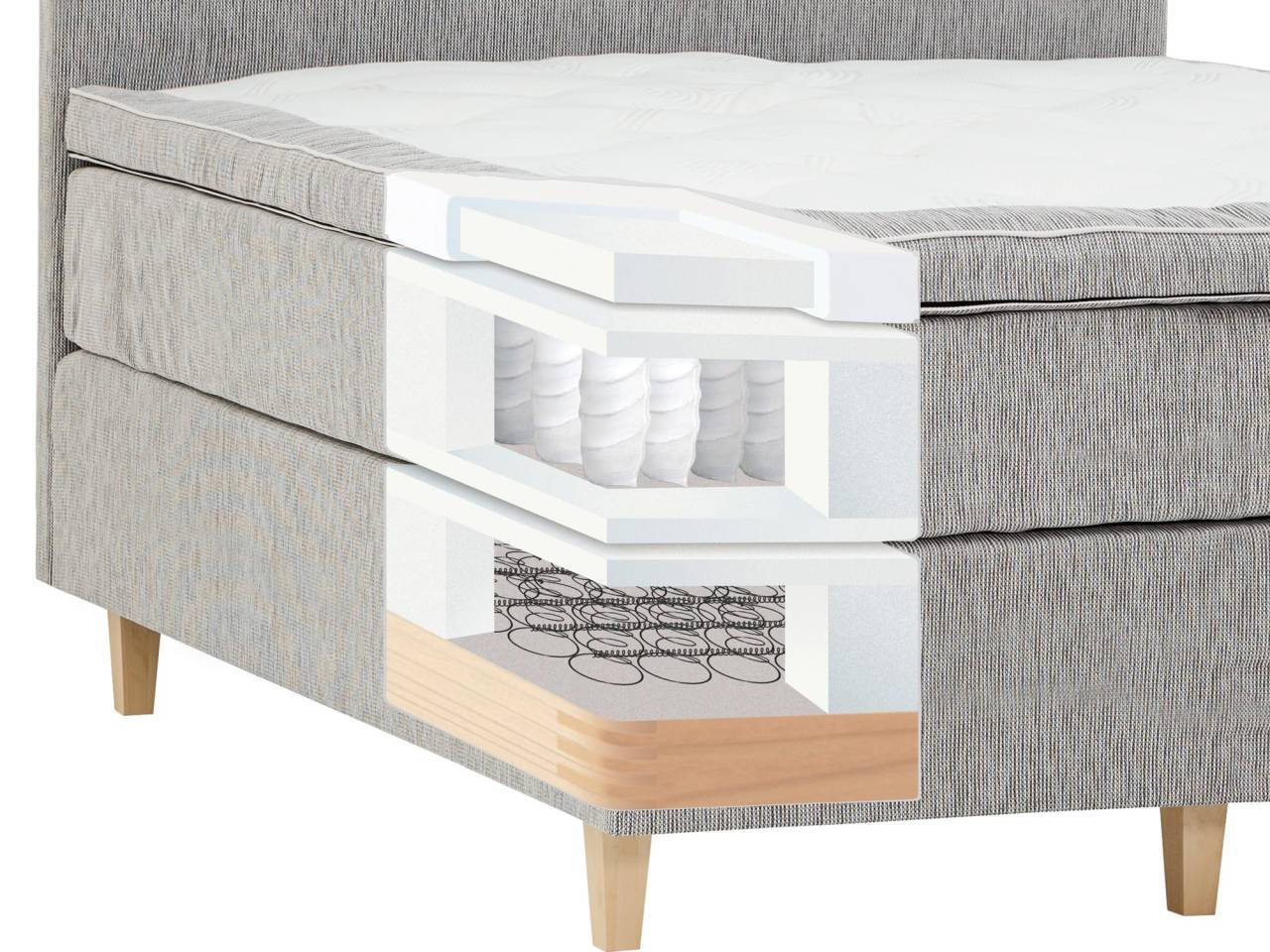 Resårmadrass: Pocket, 270 fjädrar per m²av 1,8 mm tjock tråd, 20 cm hög.