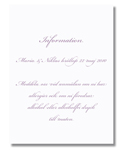 Yksiosainen infokortti on loistava paikka kertoa erilaisia käytännön asioita vieraillenne, kuten esim. ajo-ohjeita kirkolle ja juhlapaikalle, majoitusvaihtoehtoja tai ruokajärjestelyjä. Siinä voi myös kätevästi kertoa mahdollisesta juhlapaikalle järjestetystä lastenhoidosta tai toisinpäin, toiveesta juhlia vain aikuisten kesken. Sähköisen lahjalistan tai rahatoiveen voi myös liittää infokorttiin. Infokortissa kaikki tärkeät asiat ovat siis yhdessä paikassa siistillä ja tyylikkäällä tavalla.