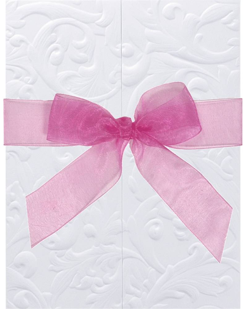Ainutlaatuinen kortti, jossa kaunis kohokuviointi yhdistyy tyylikkääksi kokonaisuudeksi elegantilla nauhalla. Voit tehdä kutsustasi täydellisesti teidän häihinne sopivan valitsemalla teemavärinne mukaisen sifonki- tai silkkinauhan! Kutsuteksti painetaan korttiin.